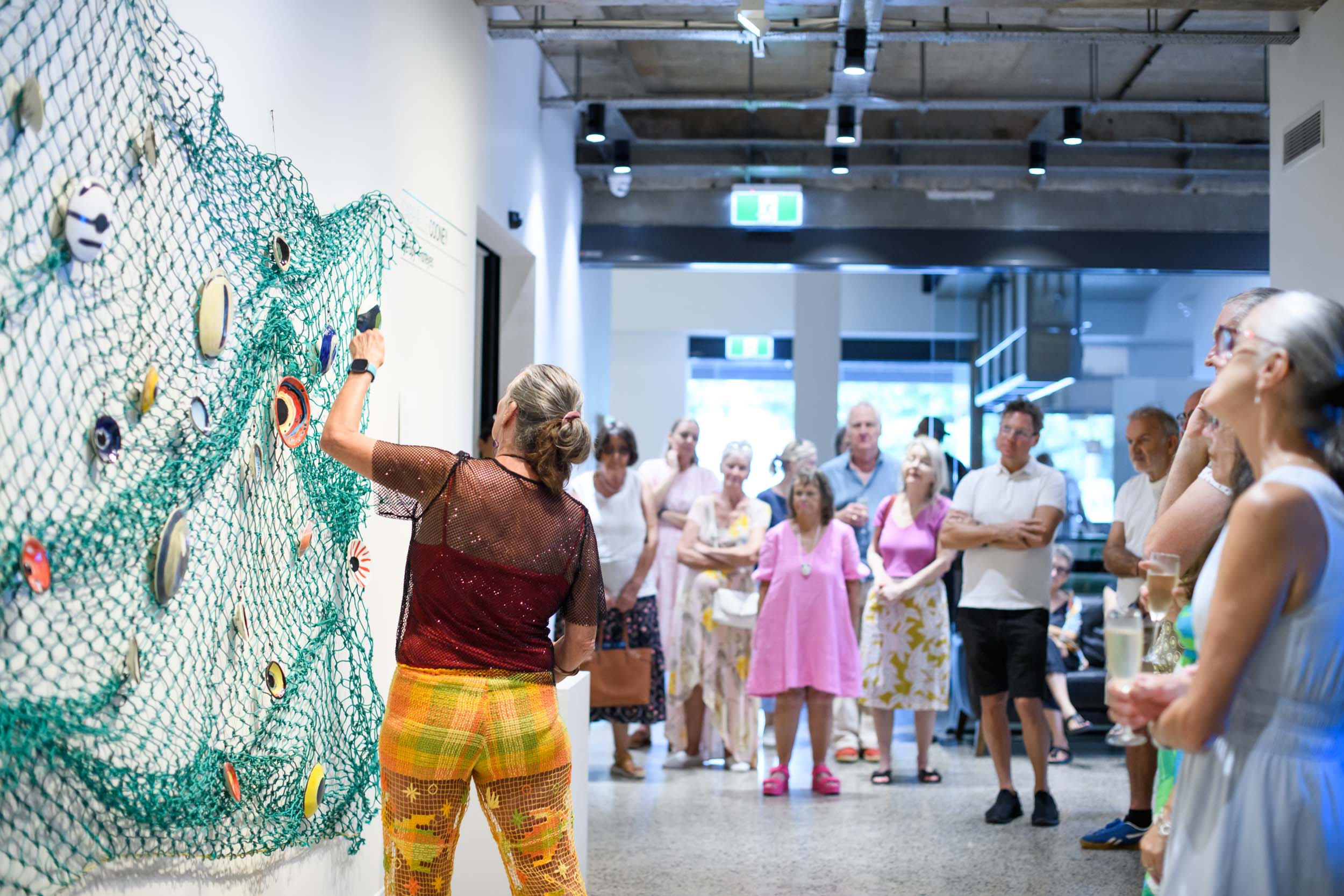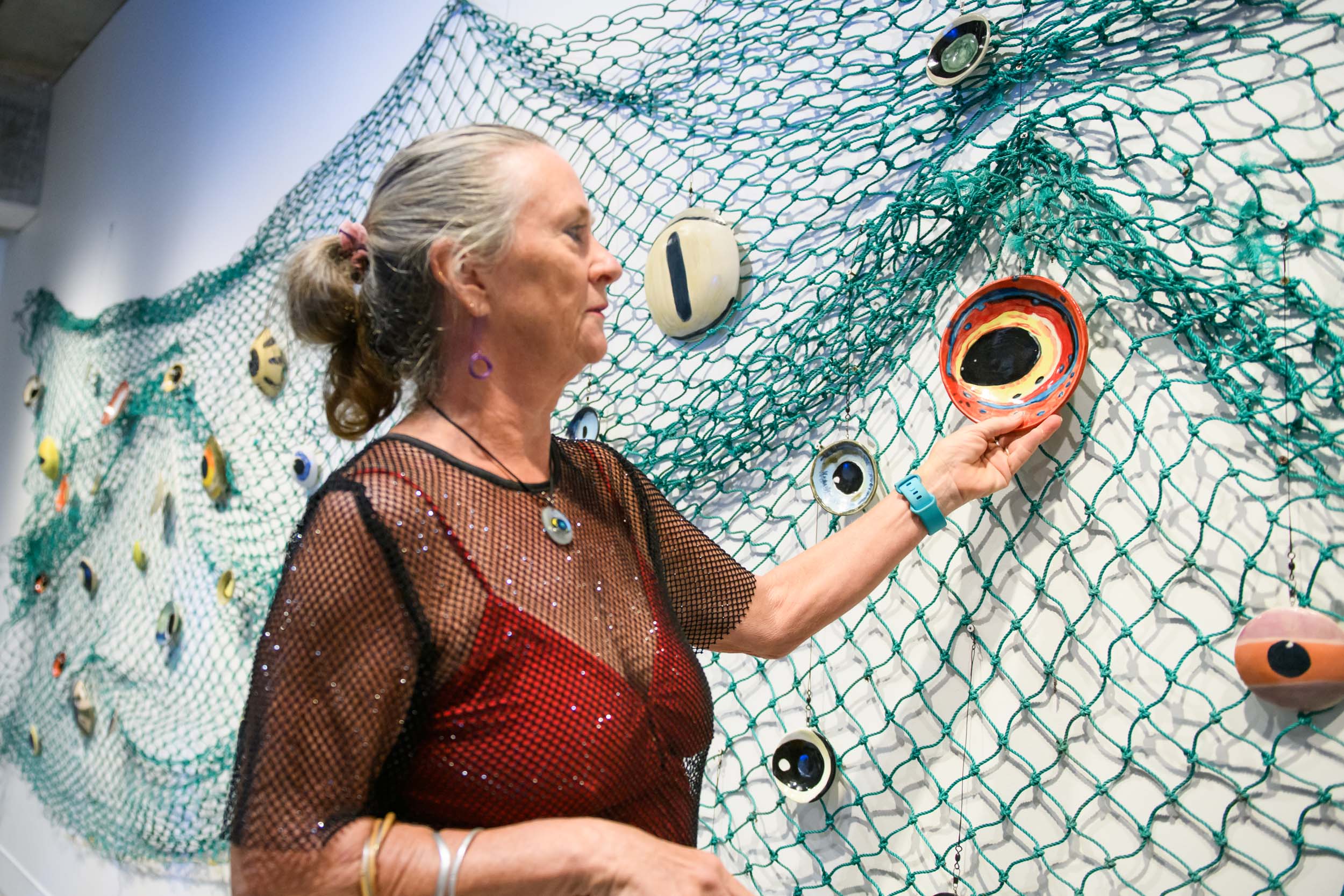 The resulting installation comprises 43 unique ceramic fish‑eye plates, each one individually shaped, glazed, and fired to celebrate the distinct textures, colours, and patterns observed in marine life. Suspended delicately from lengths of fishing tackle and arranged across an expanse of reclaimed fishing net, the work transforms everyday maritime materials into a sculptural environment that evokes both the beauty and the fragility of ocean ecosystems. The use of salvaged netting also subtly acknowledges the impact of human activities on marine habitats while re‑contextualising these materials through an aesthetic lens.