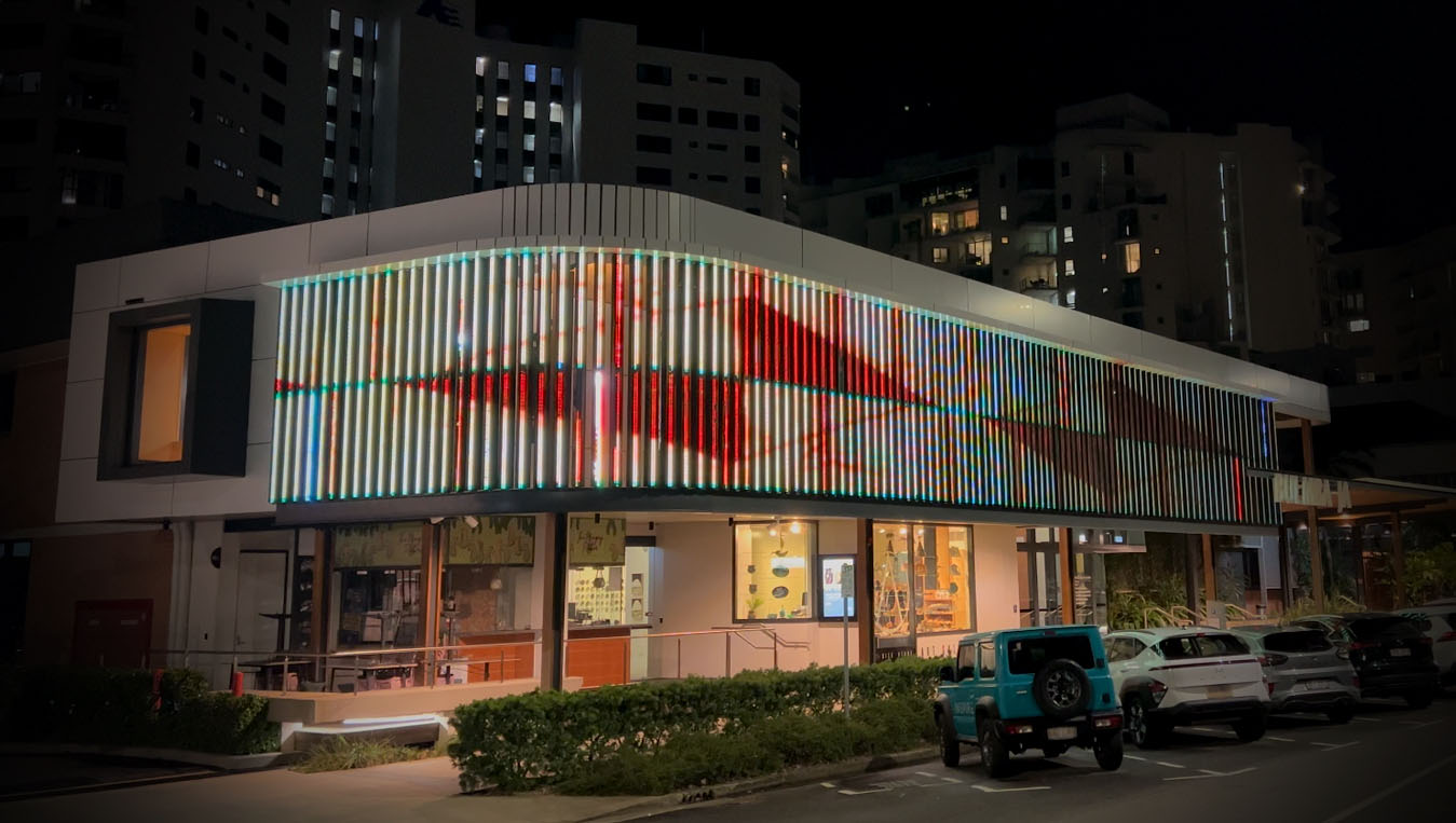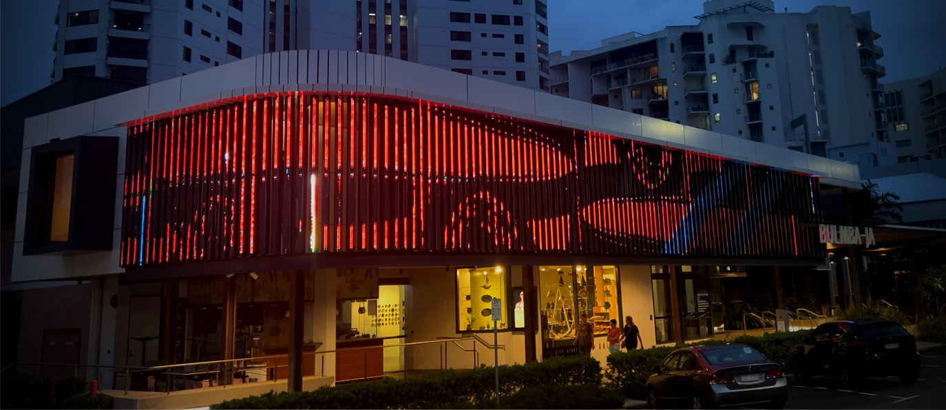Arts Queensland proudly presents Lighthouse, an innovative body of work by artist Zane Saunders. This project combines traditional printmaking techniques with contemporary animation to create a visual dialogue that bridges ancient cultural narratives and modern artistic expression – presented on Bulmba-ja digital façade.